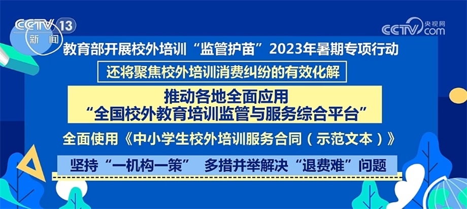 專(zhuān)項(xiàng)行動(dòng)還將聚焦校外培訓(xùn)消費(fèi)糾紛的有效化解。推動(dòng)各地全面應(yīng)用“全國(guó)校外教育培訓(xùn)監(jiān)管與服務(wù)綜合平臺(tái)”,全面使用《中小學(xué)生校外培訓(xùn)服務(wù)合同(示范文本)》,堅(jiān)持“一機(jī)構(gòu)一策”,多措并舉解決“退費(fèi)難”問(wèn)題。