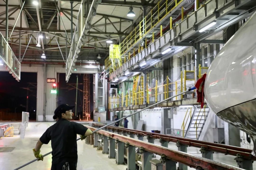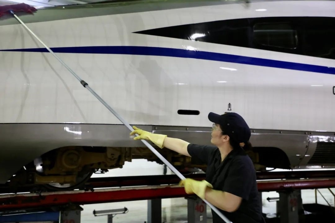 動車組經過洗車機時,調度室內調度員精準聯(lián)控司機,機房有專業(yè)的設備操作人員負責監(jiān)控,確保洗車機正常運轉,外皮清洗到位。在動車檢修庫內,質檢員全方位卡控人工清洗環(huán)節(jié),檢查清潔是否到位。