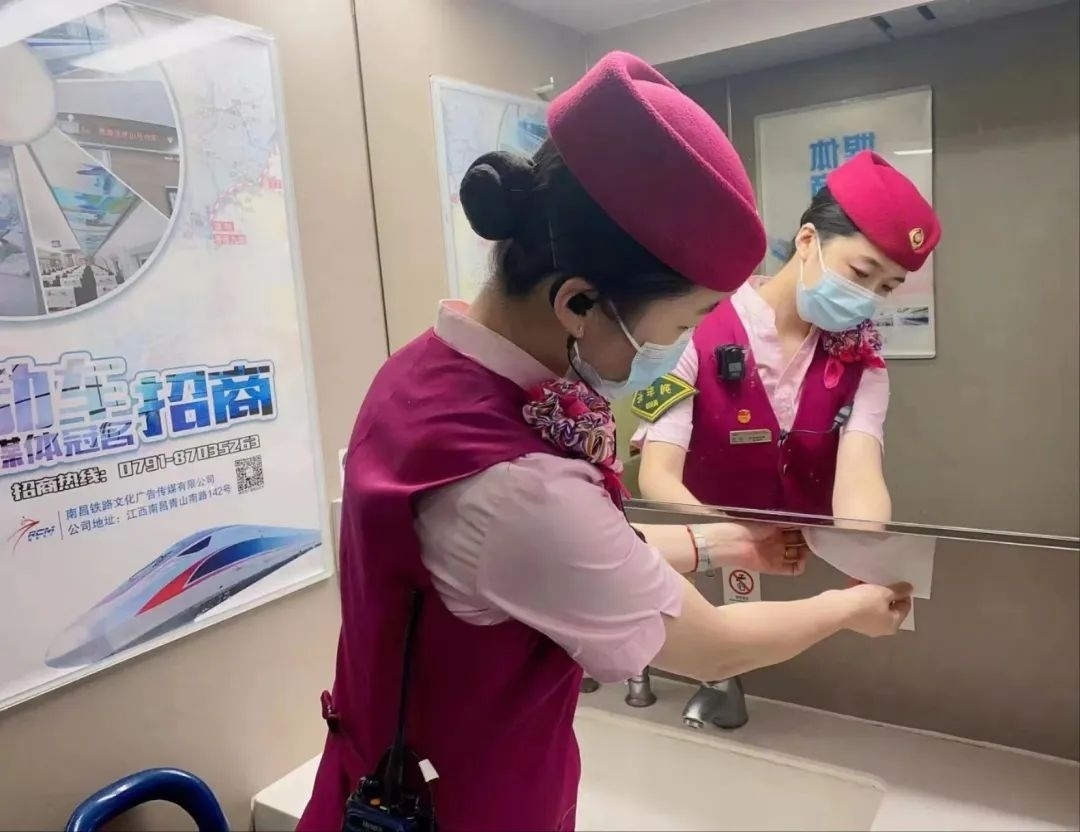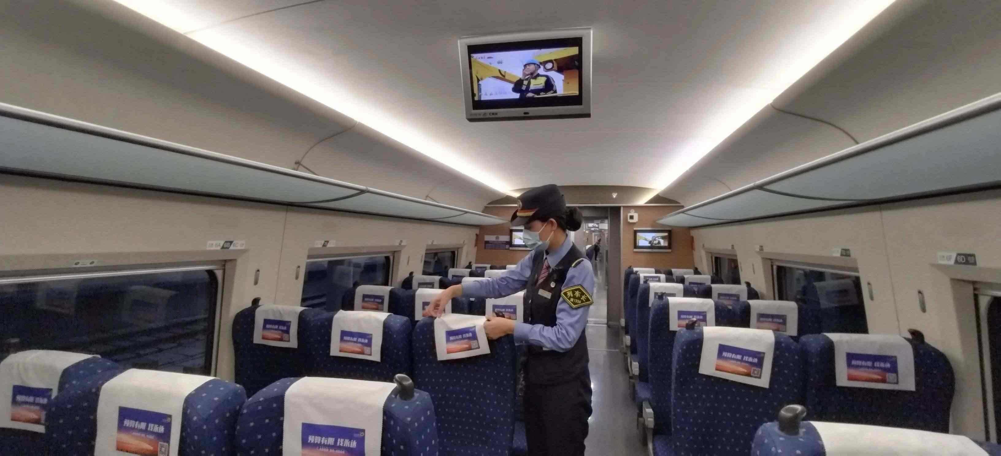 除了車身硬件的“美妝”,在列車上線始發(fā)前,列車乘務人員還要檢查各類客運服務備品、衛(wèi)生備品等是否準備齊全。他們需要保證車座椅背后網兜清潔袋擺放整齊,小桌板統(tǒng)一收起,頭枕巾和椅套擺放平整、干凈、無污染。
