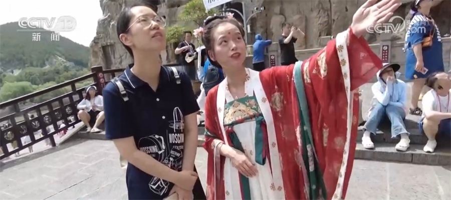 ?????? 記者 徐倩:在龍門石窟,我發(fā)現(xiàn)一個很特別的點,往年來這里,都是導游來陪大家一起逛龍門石窟、來講解。今年的導游做了一個服務升級,會穿著這種比較有特色的唐裝。
