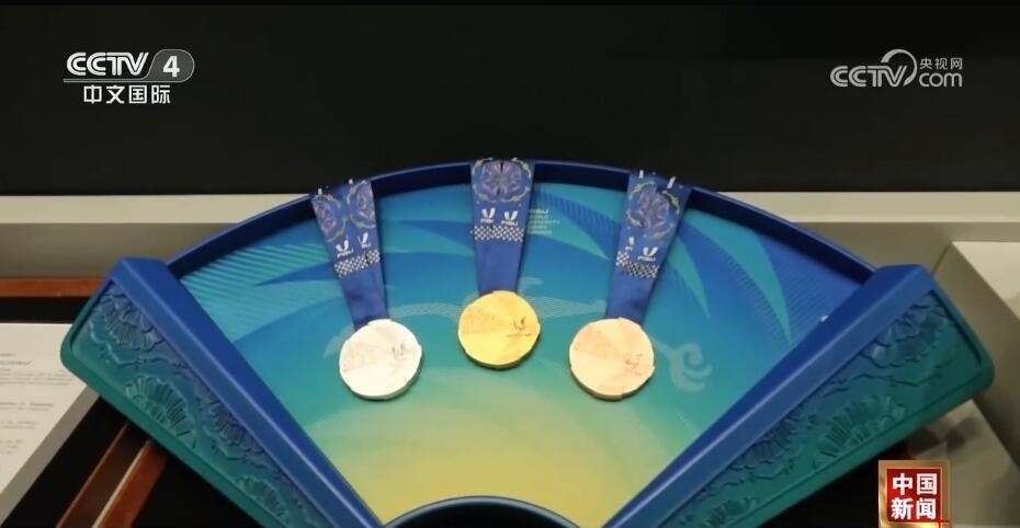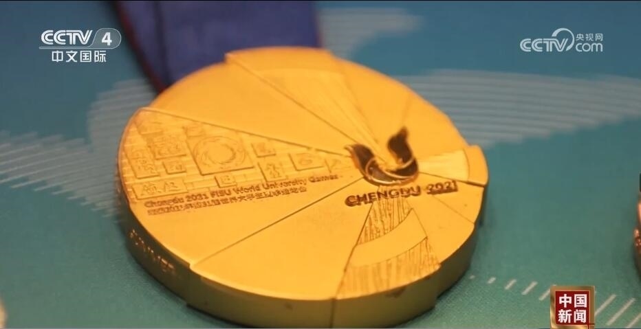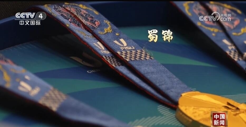 總臺(tái)記者 王豐:走進(jìn)成都大運(yùn)會(huì)博物館,最大的感受就是成都的元素?zé)o處不在。比如,我們剛一進(jìn)來(lái),右手邊是成都大運(yùn)會(huì)的吉祥物蓉寶??赐耆貙殠鷣?lái)看看蓉光,什么是蓉光呢?獎(jiǎng)牌代表了成都大運(yùn)會(huì)的榮譽(yù),“蓉”是取自成都的簡(jiǎn)稱(chēng),包含了光榮和融合的含義,整個(gè)獎(jiǎng)牌的設(shè)計(jì)是呈現(xiàn)了不規(guī)則的圓形。另外,獎(jiǎng)牌的元素包含成都市的標(biāo)志——太陽(yáng)神鳥(niǎo)。此外,在獎(jiǎng)牌的綬帶設(shè)計(jì)上首次采用了蜀錦的制作工藝,實(shí)際上也是非物質(zhì)文化遺產(chǎn)活化利用的非常好的案例。