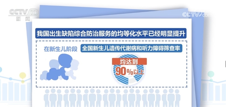 2009年以來,累計(jì)為1.3億名農(nóng)村生育婦女補(bǔ)服葉酸;全國婚檢率從2011年的41.9%提高至2021年的70.9%;全國產(chǎn)前篩查率從2011年的22.7%提高至2021年的85.7%;全國新生兒遺傳代謝病和聽力障礙篩查率均達(dá)到90%以上。建立起出生缺陷三級(jí)防治體系。