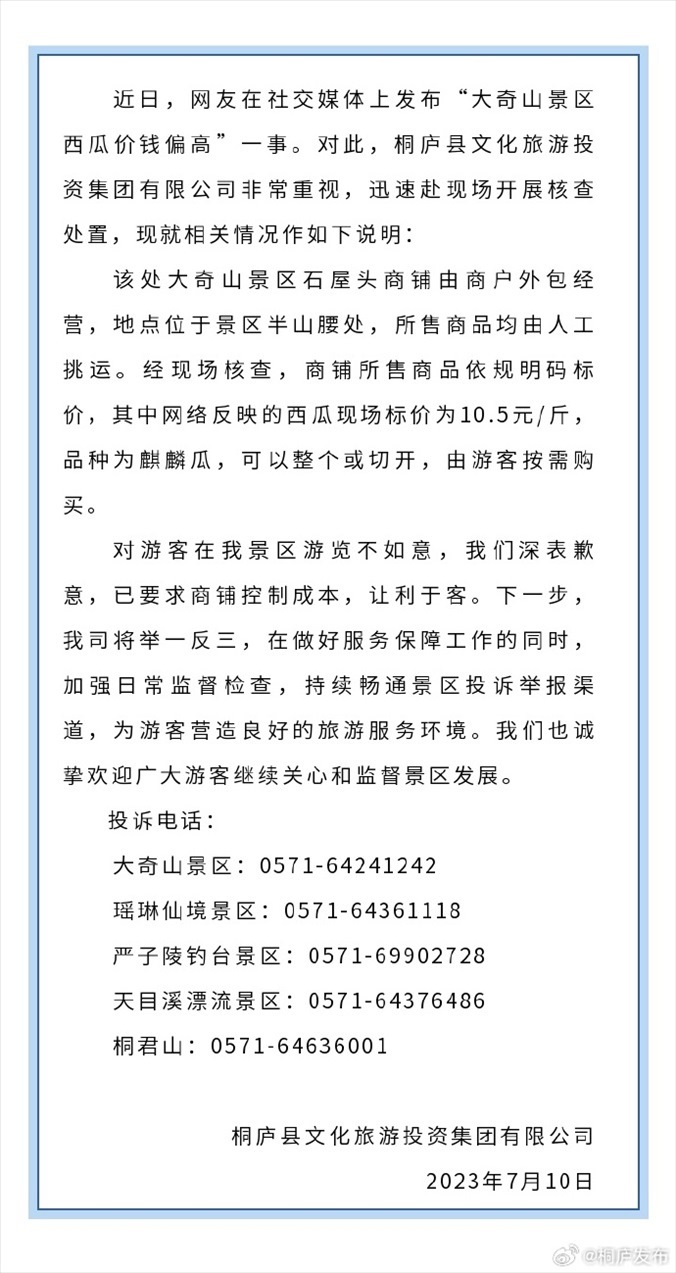 ·一游客反映大奇山景區(qū)一個西瓜賣200多元。10日,桐廬文旅集團致歉稱,商品均由人工挑運,對游客在景區(qū)游覽不如意深表歉意,已要求商鋪控制成本,讓利于客。
