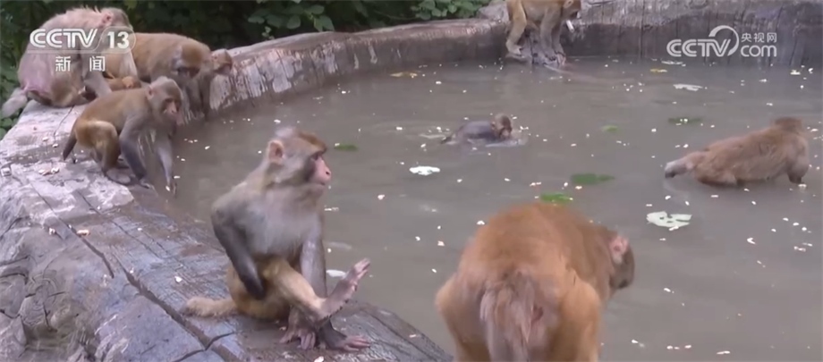 管理員介紹,假如獼猴群棲息地附近沒(méi)有水源,保護(hù)區(qū)就會(huì)人為設(shè)置水池,從山下通過(guò)泵站把水抽上來(lái),供獼猴消夏解暑。
