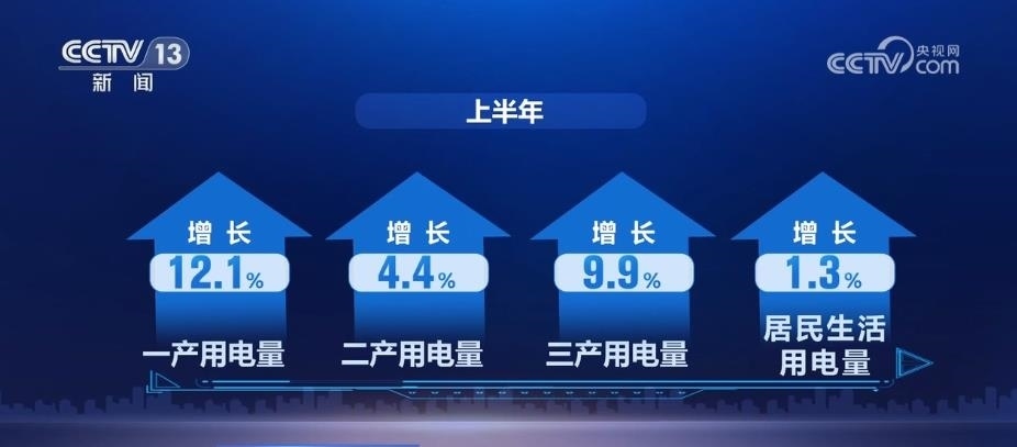 從用電情況看,上半年,全國全社會用電量同比增長5.0%。其中,一產、二產、三產和居民生活用電量分別增長12.1%、4.4%、9.9%和1.3%。