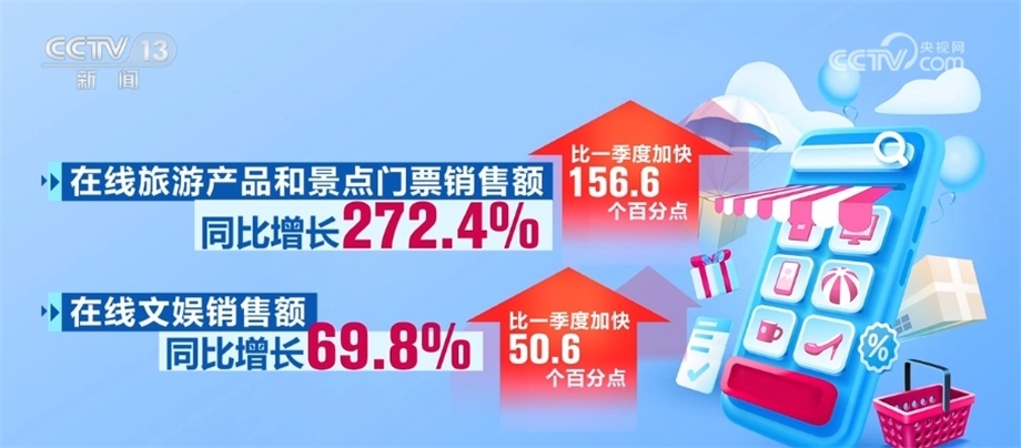 在線服務(wù)消費增勢較好。上半年,在線餐飲銷售額同比增長27.9%。在線旅游產(chǎn)品和景點門票、在線文娛銷售額同比分別增長272.4%和69.8%,比一季度分別加快156.6和50.6個百分點。