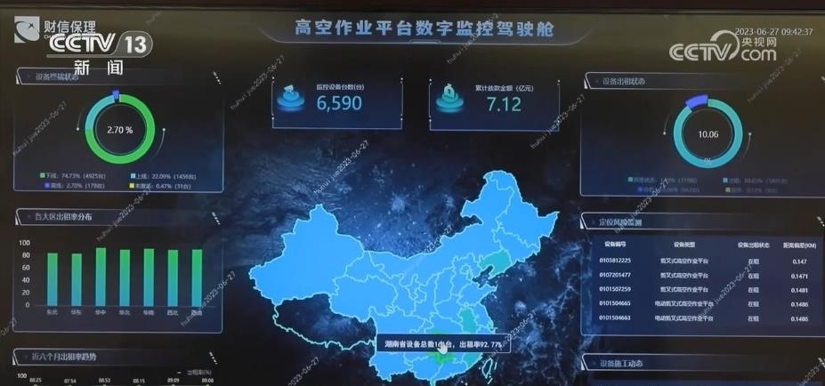 在湖南這家金融機(jī)構(gòu)的大屏幕上,一個(gè)個(gè)小點(diǎn)組成了全國(guó)6500多臺(tái)高空作業(yè)設(shè)備的實(shí)時(shí)運(yùn)行數(shù)據(jù)圖。動(dòng)動(dòng)手指,生產(chǎn)的每臺(tái)設(shè)備的地理位置、開(kāi)機(jī)狀態(tài)和運(yùn)行情況等數(shù)據(jù)都清晰可見(jiàn)。