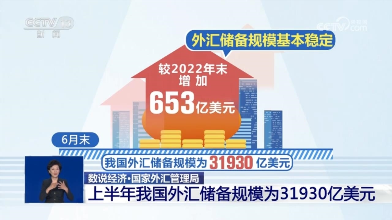 外匯儲備規(guī)?;痉€(wěn)定。截至2023年6月末,我國外匯儲備規(guī)模為31930億美元,較2022年末增加653億美元。