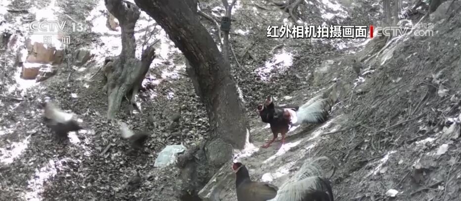 近日,在山西呂梁的孝義市國有林場,紅外相機(jī)記錄到國家一級(jí)保護(hù)野生動(dòng)物褐馬雞最大種群。畫面中,先是兩群褐馬雞在兩棵老樹下覓食玩耍,兩個(gè)樹洞內(nèi)積有雨水,它們不斷地前往飲水補(bǔ)給。突然,一只落單的成年褐馬雞入侵,遭到領(lǐng)地一只雄性褐馬雞的追逐驅(qū)趕。不同角度的紅外相機(jī)還捕捉到褐馬雞好奇對視相機(jī)、幼崽上樹打鬧等趣味十足的珍貴影像。
