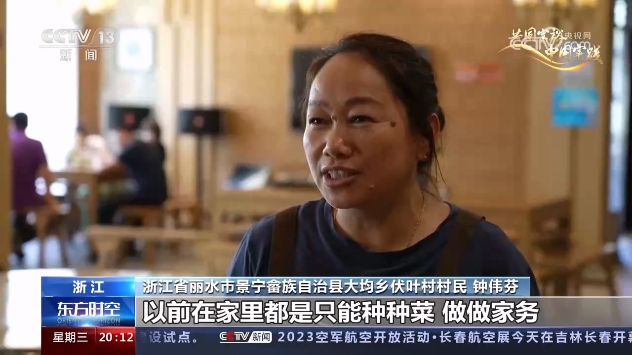 浙江省麗水市景寧畬族自治縣大均鄉(xiāng)伏葉村村民 鐘偉芬:以前在家里都只能種種菜、做家務(wù),別的一分錢都掙不來,現(xiàn)在在家門口(就業(yè))。這里的服務(wù)員全部都是我們本村的,五六十歲了,出去打工也沒人要,在這里干干服務(wù)員一個月還能收入三千,這也很好的。