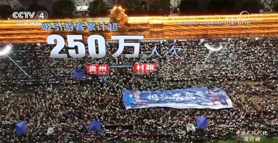據(jù)統(tǒng)計(jì),自今年5月“村超”開賽至7月上旬,榕江縣累計(jì)吸引游客超250萬(wàn)人次,實(shí)現(xiàn)旅游綜合收入28.39億元。“村超”不僅展現(xiàn)了當(dāng)代中國(guó)農(nóng)民豐富的精神文化生活,更助推了鄉(xiāng)村振興。