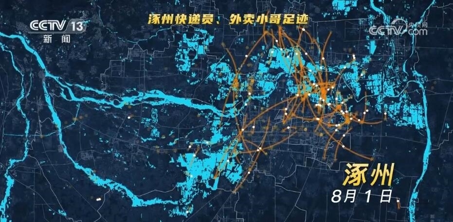 8月1日到8月2日,幾乎在24小時(shí)內(nèi),涿州小城就增加了近1.7萬個(gè)外地手機(jī)信令,尤其有將近1萬人從外省趕到涿州,我們從新聞中看到了來自各地的救援“逆行者”,爭分奪秒地向受災(zāi)最嚴(yán)重的地方挺進(jìn)。