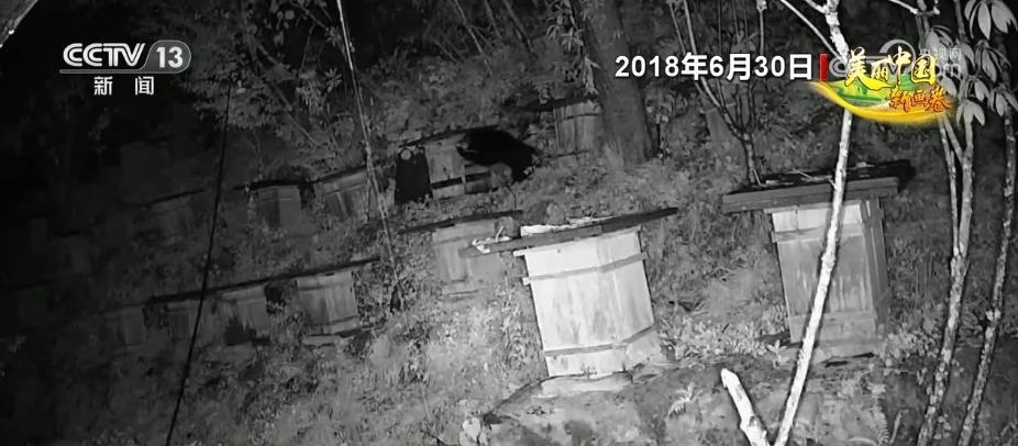 在湖北堵河源國(guó)家級(jí)自然保護(hù)區(qū),經(jīng)常會(huì)發(fā)生黑熊下山偷食百姓的莊稼、蜂蜜等農(nóng)產(chǎn)品。記者通過當(dāng)?shù)匾晃淮迕裉峁┑囊曨l看到,2018年晚上一頭成年黑熊來到一蜂箱放置點(diǎn),黑熊為了取食蜂蜜推倒了一箱蜂箱,并啃食了幾口蜂蜜。