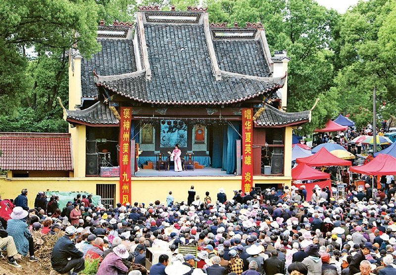 為豐富群眾文化生活,江蘇省南京市高淳區(qū)椏溪街道藍(lán)溪村專門邀請(qǐng)杭州青年越劇團(tuán)來村里演出,讓村民在家門口享受文化大餐。圖為2023年5月7日,藍(lán)溪村大山戲樓上,演員正在表演越劇《紅樓夢(mèng)》。 人民圖片 高曉平/攝