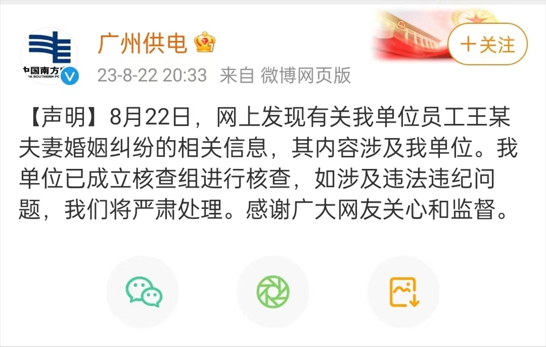 ·廣州供電局回應員工遭妻子舉報行賄30萬入職:已成立核查組。