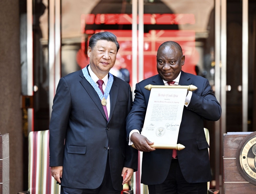 會談后,拉馬福薩向習(xí)近平授予“南非勛章”,這是南非授予重要友好國家元首的最高級別勛章和最高榮譽(yù)。