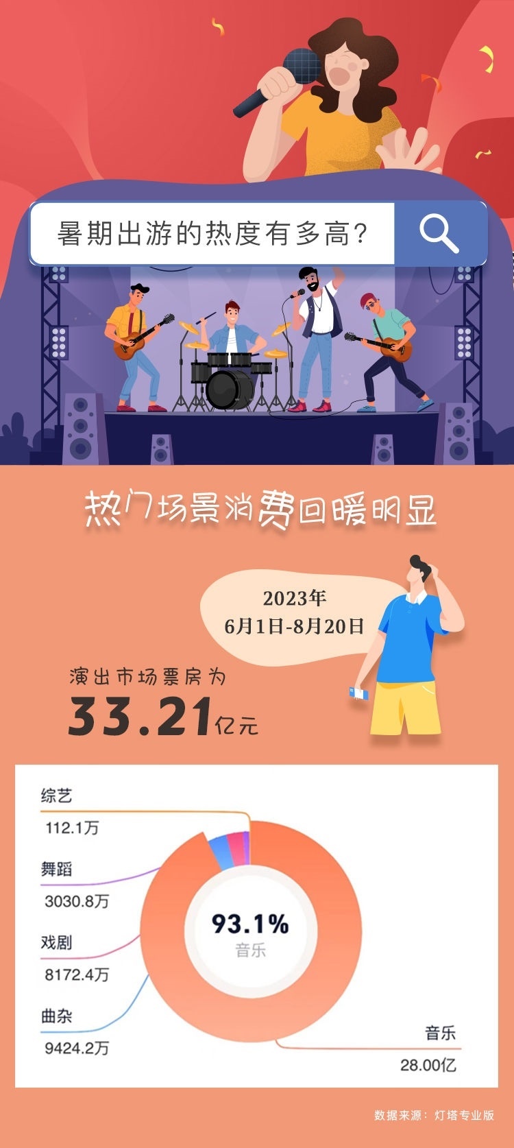 作為演出市場的傳統(tǒng)旺季,暑假期間演唱會(huì)、Live house、戲劇、音樂劇等各類熱門演出“一票難求”。根據(jù)燈塔專業(yè)版最新數(shù)據(jù),暑期檔中的6月1日至8月23日演出市場票房已經(jīng)超過30億元,而相當(dāng)可觀的跨城觀演比例,更引得除了演出票房之外的周邊產(chǎn)業(yè)一起火?!耙粋€(gè)演出圈粉一座城”,當(dāng)?shù)芈糜谓?jīng)濟(jì)不斷涌現(xiàn)新的可能。