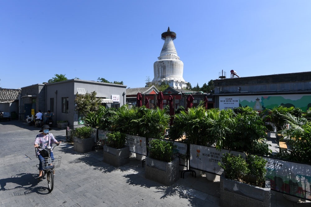 午后的北京西城區(qū)宮門口西岔胡同,居民們納涼聊天,一間間老字號(hào)燒餅店、特色咖啡廳、精釀啤酒館各成風(fēng)景。抬頭望去,青磚灰瓦與紅墻綠樹(shù)之上,妙應(yīng)寺白塔莊重滄桑,古樸與現(xiàn)代相映成趣。