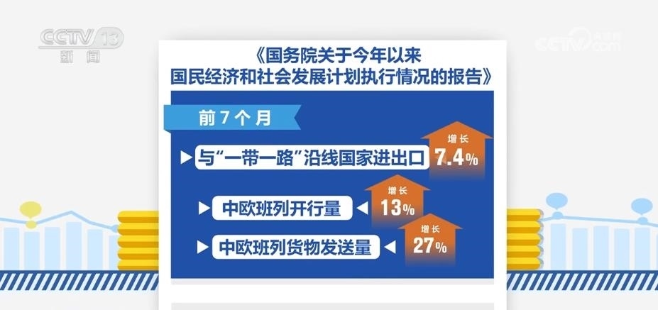 報(bào)告顯示,共建“一帶一路”持續(xù)推進(jìn)。鞏固拓展與重點(diǎn)共建國家和國際組織的務(wù)實(shí)合作,進(jìn)一步強(qiáng)化風(fēng)險(xiǎn)防控,前7個(gè)月與“一帶一路”沿線國家進(jìn)出口增長7.4%,中歐班列開行量、貨物發(fā)送量分別增長13%、27%。