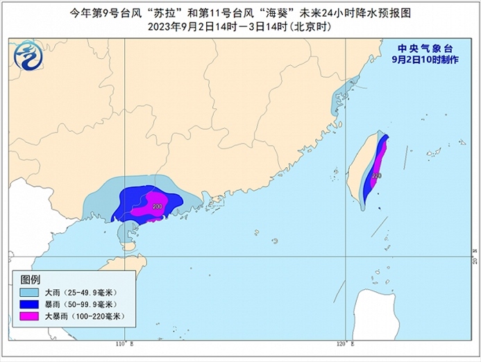 降水預(yù)報:9月2日14時至3日14時,受“蘇拉”和“海葵”影響,廣東西南部、廣西東南部、福建東北部沿海、臺灣島東部等地有大到暴雨,其中,廣東西南部、臺灣島東部等地部分地區(qū)有大暴雨(100~220毫米)。