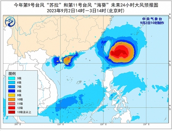 大風(fēng)預(yù)報:9月2日14時至3日14時,受“蘇拉”影響,南海西北部、北部灣東部、瓊州海峽及廣東中西部沿海、廣西南部沿海、海南北部沿海、珠江口以及香港和澳門等地將有6-8級、陣風(fēng)9-10級的大風(fēng),“蘇拉”中心經(jīng)過的附近海面或地區(qū)風(fēng)力有11-12級、陣風(fēng)13-14級;受“??庇绊懀_灣海峽、巴士海峽、浙江南部沿海、福建沿海、廣東東部沿海、臺灣島沿海將有6-8級,陣風(fēng)9-10級大風(fēng),臺灣以東洋面部分海域風(fēng)力可達(dá)9-12級,陣風(fēng)13-14級,“??敝行慕?jīng)過的附近海面風(fēng)力可達(dá)13-16級,陣風(fēng)17級及以上。