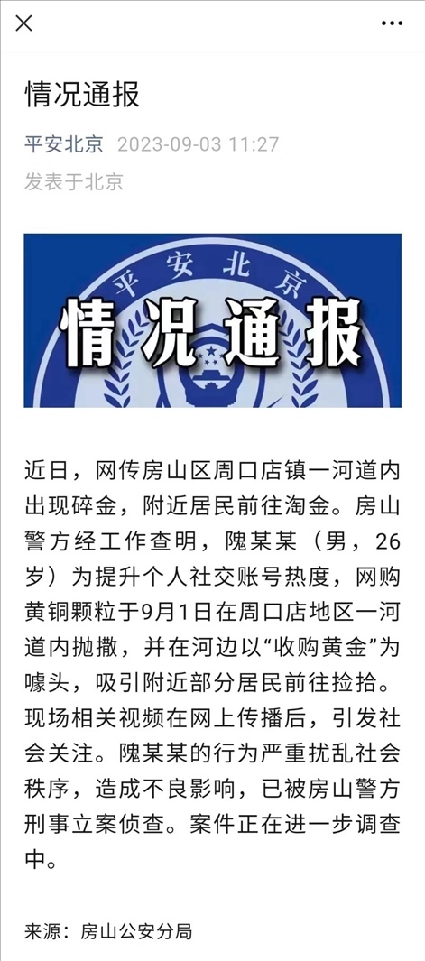 ·北京警方通報房山一河道出現碎金疑似物:實為一男子網購黃銅顆粒拋撒。