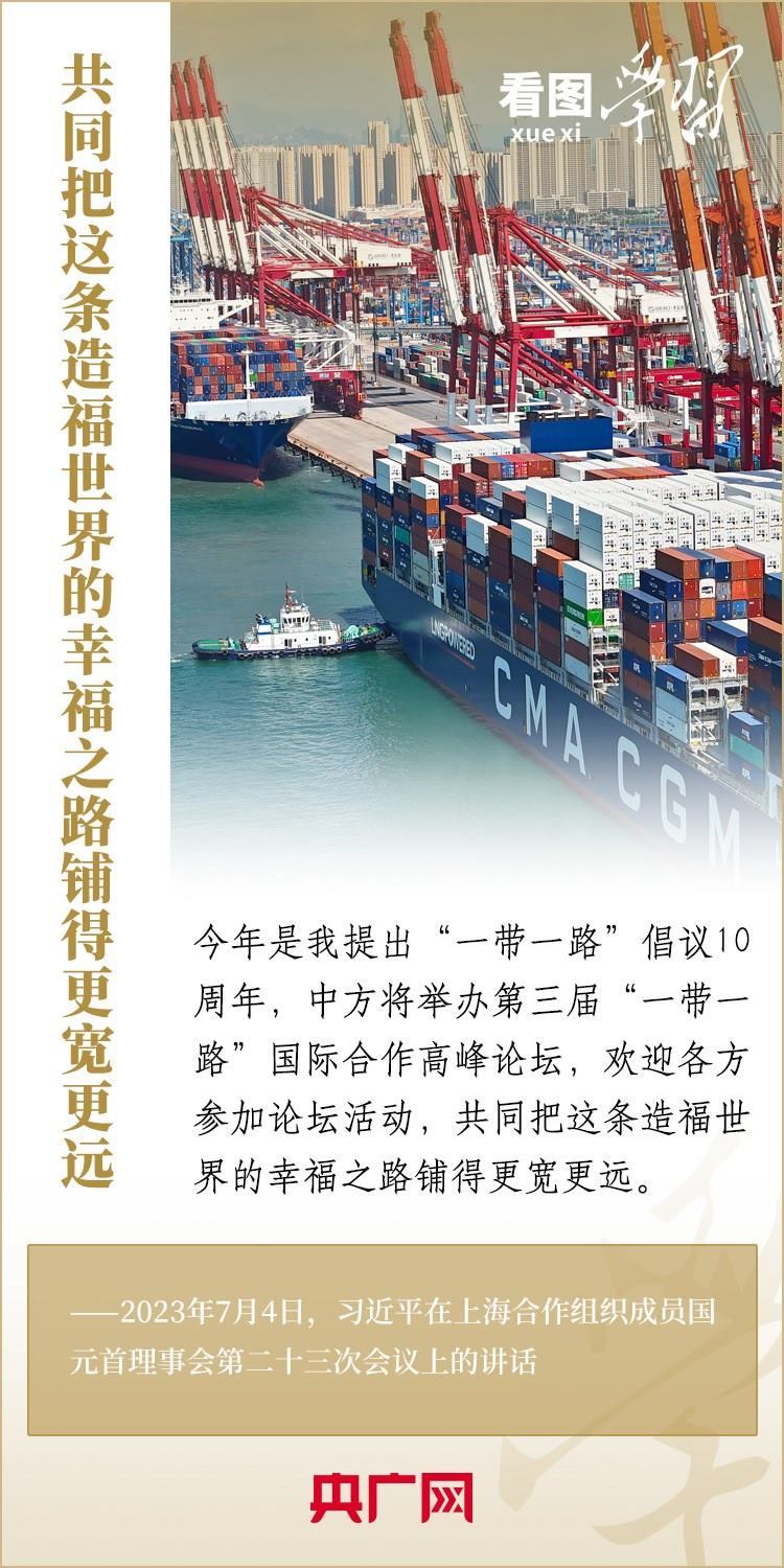 2013年金秋,習(xí)近平主席開創(chuàng)性提出共建“絲綢之路經(jīng)濟(jì)帶”和“21世紀(jì)海上絲綢之路”,即“一帶一路”倡議。十年來,共建“一帶一路”倡議從共商共建共享的“大寫意”,到精謹(jǐn)細(xì)膩的“工筆畫”,影響力和感召力不斷擴大。在“一帶一路”倡議提出10周年之際,《看圖學(xué)習(xí)》為您梳理習(xí)近平主席的一系列重要論述。一起來學(xué)習(xí)!
