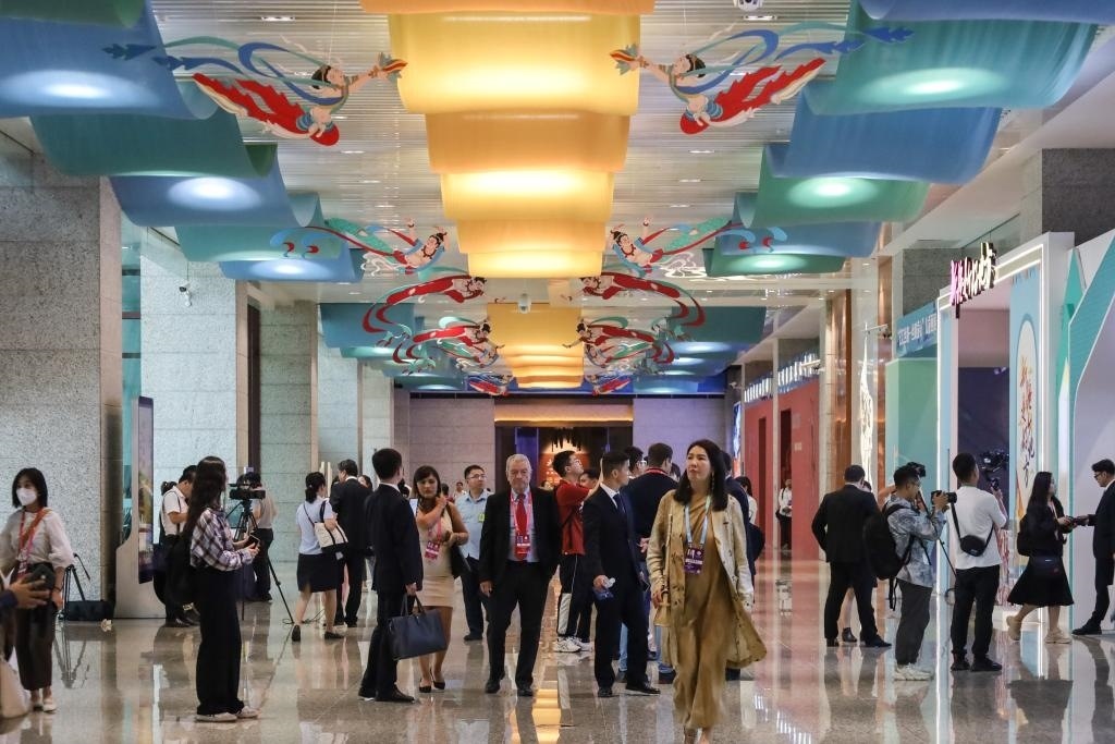 9月6日,與會嘉賓在第六屆絲綢之路(敦煌)國際文化博覽會上參觀文創(chuàng)產(chǎn)品和文旅裝備展銷活動。新華社記者 馬希平 攝
