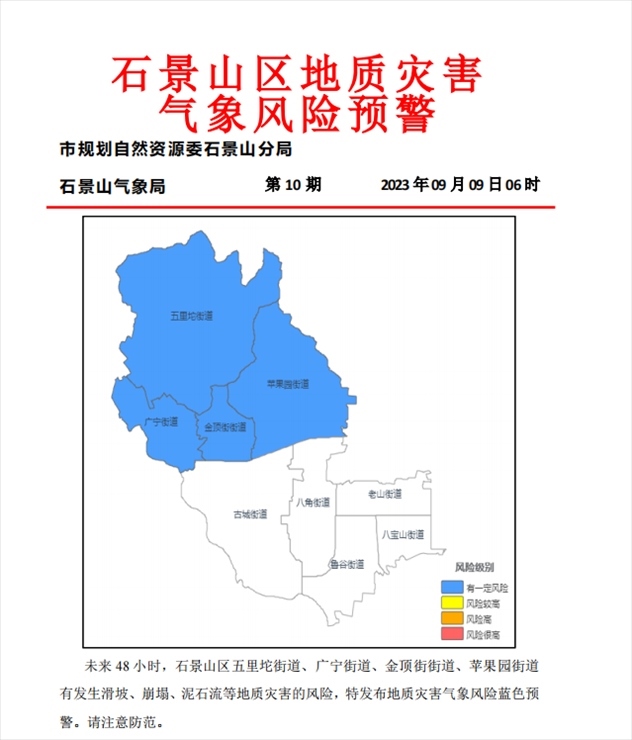 石景山區(qū)五里坨街道、廣寧街道、金頂街街道、蘋果園街道有發(fā)生滑坡、崩塌、泥石流等地質(zhì)災(zāi)害的風(fēng)險,特發(fā)布地質(zhì)災(zāi)害氣象風(fēng)險藍(lán)色預(yù)警。請注意防范。
