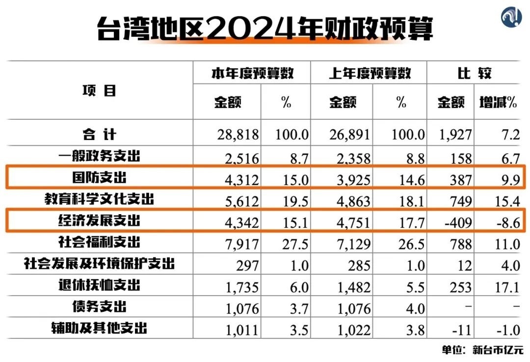 民進(jìn)黨當(dāng)局不久前通過(guò)的2024年財(cái)政預(yù)算案就很能說(shuō)明問(wèn)題。各項(xiàng)支出中,防務(wù)支出繼續(xù)保持增長(zhǎng),經(jīng)濟(jì)發(fā)展支出卻是所有領(lǐng)域中跌幅最大的。