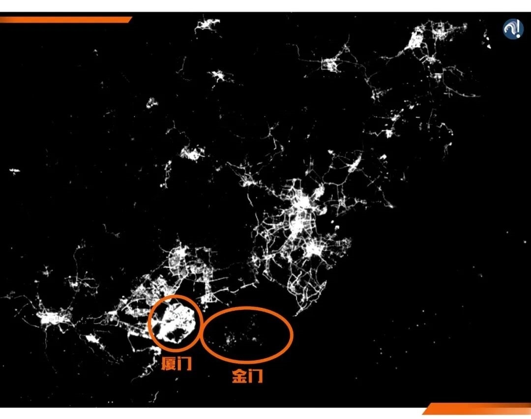 這是福建周邊的夜光遙感地圖??梢钥吹?,就在廈門被點(diǎn)亮的時(shí)候,金門卻是一片漆黑。與此同時(shí),金門的發(fā)展也有個(gè)特點(diǎn),那就是靠近大陸的地方更亮。