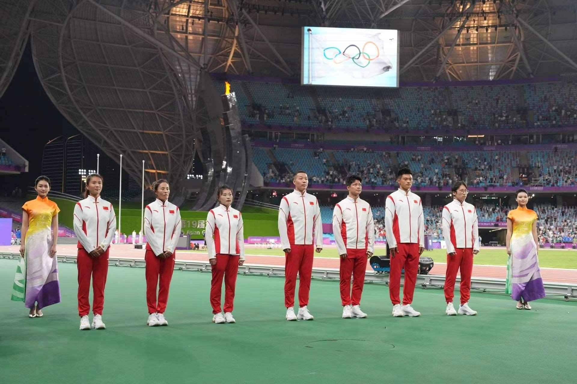 10月4日晚,在杭州亞運會田徑比賽全部結(jié)束后,中國奧委會為蘇炳添、謝震業(yè)、吳智強(qiáng)、湯星強(qiáng)、切陽什姐、劉虹和呂秀芝補(bǔ)發(fā)了奧運會獎牌。