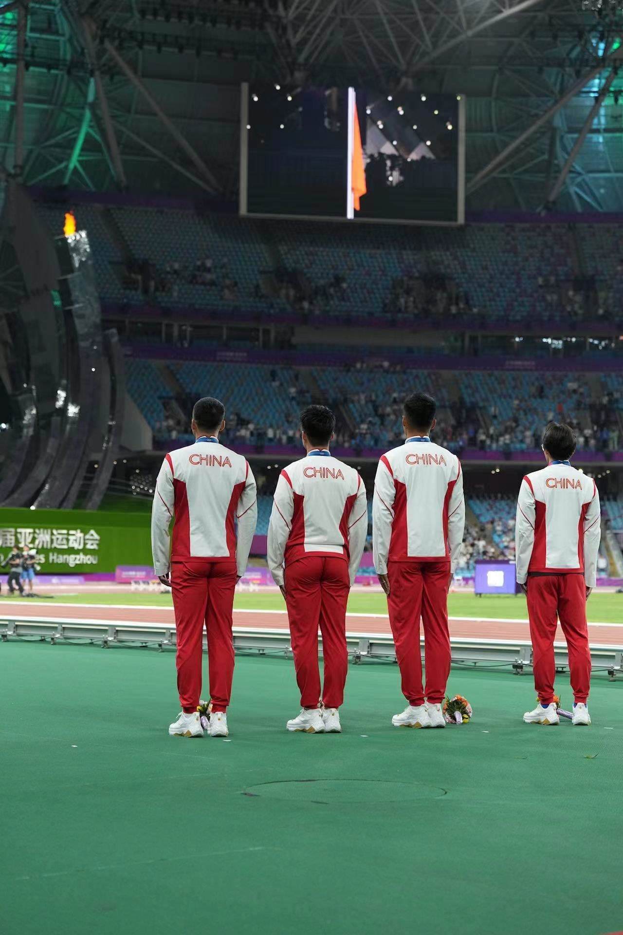 補(bǔ)發(fā)現(xiàn)場,首先頒發(fā)的是男子4×100米接力銅牌。四位中國小伙子笑著走上銅牌領(lǐng)獎臺,接受頒獎。隨后的競走頒獎儀式上,在三位得獎運動員獲頒獎牌后,《義勇軍進(jìn)行曲》奏響,三面五星紅旗冉冉升起,切陽什姐眼中涌動著晶瑩的淚花。