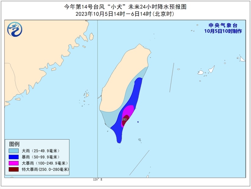 降水預(yù)報:5日14時至6日14時,臺灣島東部和南部有大到暴雨,臺灣島東南部部分地區(qū)有大暴雨,局地特大暴雨(250-280毫米)。