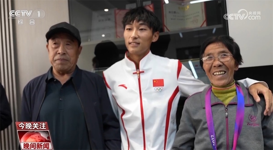 田徑比賽男子4×100米接力決賽中,第四棒陳佳鵬接棒時(shí),中國(guó)隊(duì)稍微落后。憑借強(qiáng)大的后程加速能力,陳佳鵬在最后30米逆轉(zhuǎn)對(duì)手率先撞線,中國(guó)隊(duì)收獲金牌。奪冠后陳佳鵬回到老家,先后把金牌掛在了媽媽和奶奶的脖子上,合影時(shí)奶奶笑得合不攏嘴。