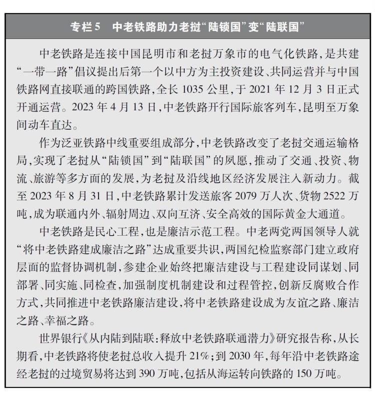 經(jīng)濟(jì)走廊和國(guó)際通道建設(shè)卓有成效。共建國(guó)家共同推進(jìn)國(guó)際骨干通道建設(shè),打造連接亞洲各次區(qū)域以及亞歐非之間的基礎(chǔ)設(shè)施網(wǎng)絡(luò)。中巴經(jīng)濟(jì)走廊方向,重點(diǎn)項(xiàng)目穩(wěn)步推進(jìn),白沙瓦-卡拉奇高速公路(蘇庫(kù)爾至木爾坦段)、喀喇昆侖公路二期(赫韋利揚(yáng)-塔科特段)、拉合爾軌道交通橙線項(xiàng)目竣工通車(chē),薩希瓦爾、卡西姆港、塔爾、胡布等電站保持安全穩(wěn)定運(yùn)營(yíng),默拉直流輸電項(xiàng)目投入商業(yè)運(yùn)營(yíng),卡洛特水電站并網(wǎng)發(fā)電,拉沙卡伊特別經(jīng)濟(jì)區(qū)進(jìn)入全面建設(shè)階段。新亞歐大陸橋經(jīng)濟(jì)走廊方向,匈塞鐵路塞爾維亞貝爾格萊德-諾維薩德段于2022年3月開(kāi)通運(yùn)營(yíng),匈牙利布達(dá)佩斯-克萊比奧段啟動(dòng)軌道鋪設(shè)工作;克羅地亞佩列沙茨跨海大橋迎來(lái)通車(chē)一周年;雙西公路全線貫通;黑山南北高速公路順利建成并投入運(yùn)營(yíng)。中國(guó)-中南半島經(jīng)濟(jì)走廊方向,中老鐵路全線建成通車(chē)且運(yùn)營(yíng)成效良好,黃金運(yùn)輸通道作用日益彰顯;作為中印尼共建“一帶一路”的旗艦項(xiàng)目,時(shí)速350公里的雅萬(wàn)高鐵開(kāi)通運(yùn)行;中泰鐵路一期(曼谷-呵叻)簽署線上工程合同,土建工程已開(kāi)工11個(gè)標(biāo)段(其中1個(gè)標(biāo)段已完工)。中蒙俄經(jīng)濟(jì)走廊方向,中俄黑河公路橋、同江鐵路橋通車(chē)運(yùn)營(yíng),中俄東線天然氣管道正式通氣,中蒙俄中線鐵路升級(jí)改造和發(fā)展可行性研究正式啟動(dòng)。中國(guó)-中亞-西亞經(jīng)濟(jì)走廊方向,中吉烏公路運(yùn)輸線路實(shí)現(xiàn)常態(tài)化運(yùn)行,中國(guó)-中亞天然氣管道運(yùn)行穩(wěn)定,哈薩克斯坦北哈州糧油專(zhuān)線與中歐班列并網(wǎng)運(yùn)行。孟中印緬經(jīng)濟(jì)走廊方向,中緬原油和天然氣管道建成投產(chǎn),中緬鐵路木姐-曼德勒鐵路完成可行性研究,曼德勒-皎漂鐵路啟動(dòng)可行性研究,中孟友誼大橋、多哈扎里至科克斯巴扎爾鐵路等項(xiàng)目建設(shè)取得積極進(jìn)展。在非洲,蒙內(nèi)鐵路、亞吉鐵路等先后通車(chē)運(yùn)營(yíng),成為拉動(dòng)?xùn)|非乃至整個(gè)非洲國(guó)家縱深發(fā)展的重要通道。