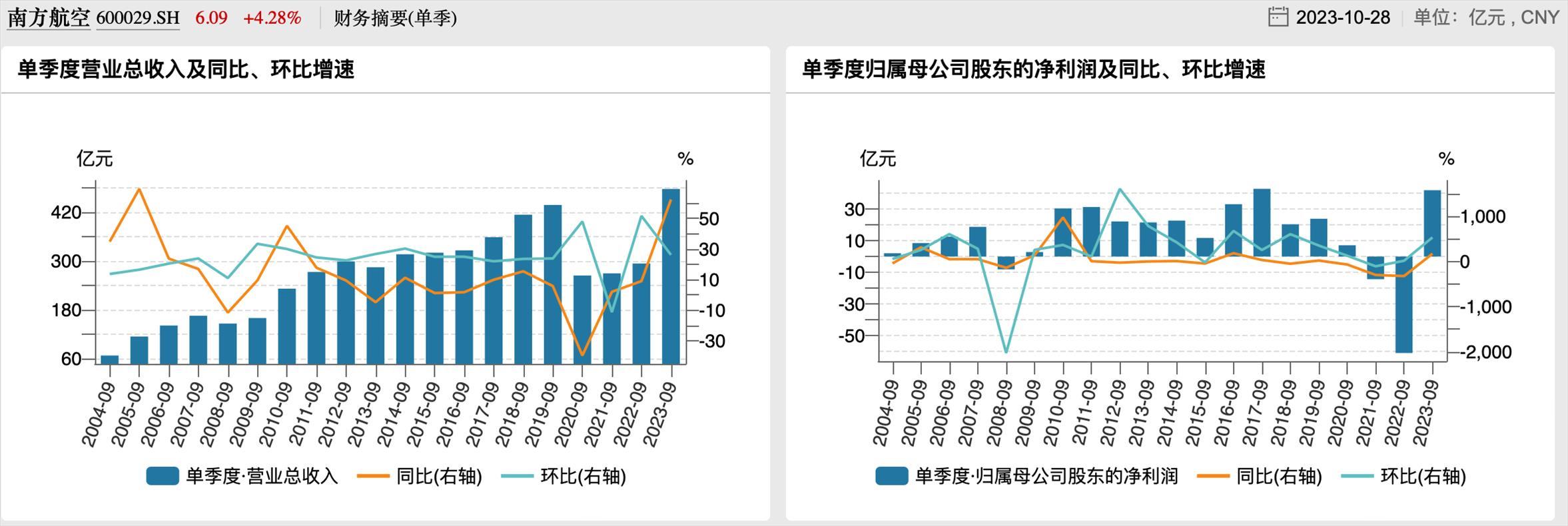 南航三季度和前三季度營(yíng)收創(chuàng)歷史同期新高,單季凈利潤(rùn)僅次于2017年水平。前三季度實(shí)現(xiàn)同比扭虧,但不及疫情前水平。