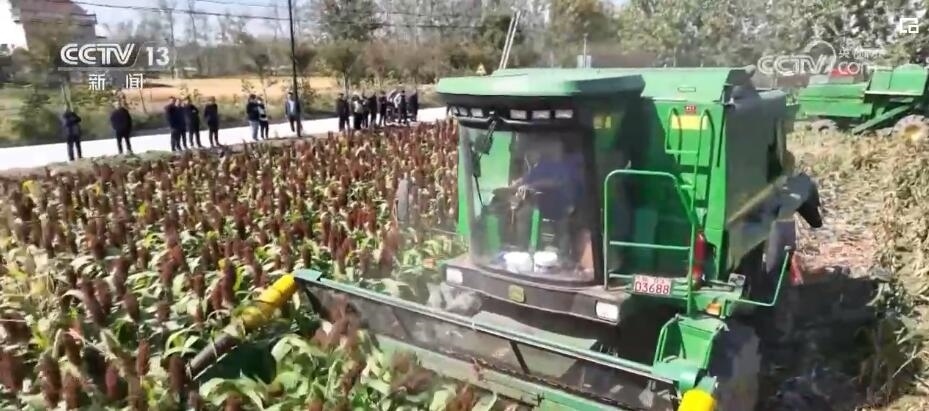 在江蘇灌南,萬畝高粱開鐮收割。一臺臺大型收割機將粒粒高粱收入囊中。