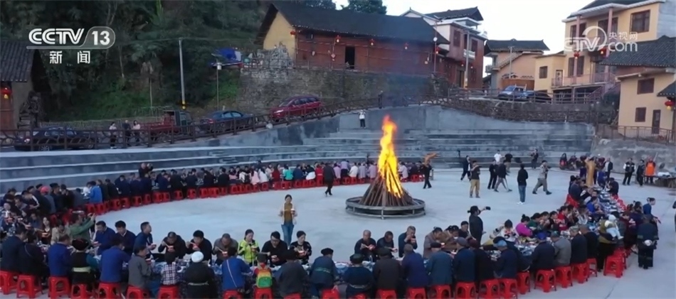 這天是十八洞村一個(gè)重要的日子,村里人聚在一起點(diǎn)起了篝火,擺起了長龍宴,見證苗家文化廣場投入使用。
