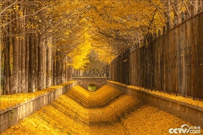 北京海淀區(qū)溫泉鎮(zhèn)街角公園,銀杏樹(shù)葉飄落,滿地金黃。