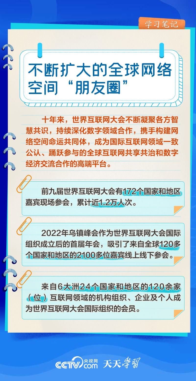 前九屆世界互聯(lián)網(wǎng)大會,習近平主席或親臨現(xiàn)場發(fā)表主旨演講,或視頻致辭,或向大會發(fā)來賀信,以不同形式關心大會舉辦。央視網(wǎng)《天天學習》欄目推出學習筆記,與您一起了解世界互聯(lián)網(wǎng)大會的十年“網(wǎng)”事。