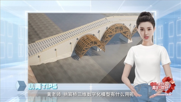 作為黃碩的好幫手,AI數(shù)字人小青給大家介紹說(shuō),三維動(dòng)畫中,展現(xiàn)了拱宸橋從選址、圍堰到打樁、搭建、填碎石的全過(guò)程,拱宸橋三維數(shù)字化項(xiàng)目成為大運(yùn)河保護(hù)傳承利用的案例之一。