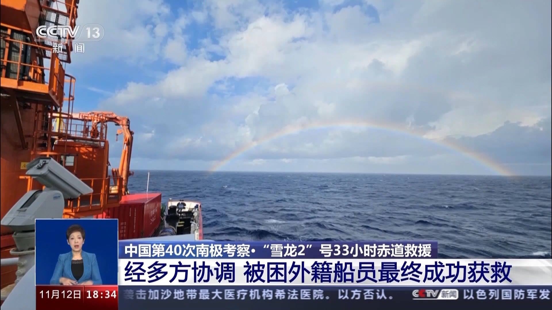 一個小時后,求救船只安全吊運到“雪龍2”號的尾部甲板,此時,原本陰雨的天空放晴,一道彩虹掛在天邊,“雪龍2”號重新起航。
