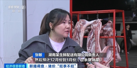 湖南某生鮮配送有限公司負(fù)責(zé)人 張敏:10月份到11月份(每天銷量)是450頭到600頭。預(yù)計(jì)12月份到1月份(白條豬銷量)會增長到一天800頭到1000頭。