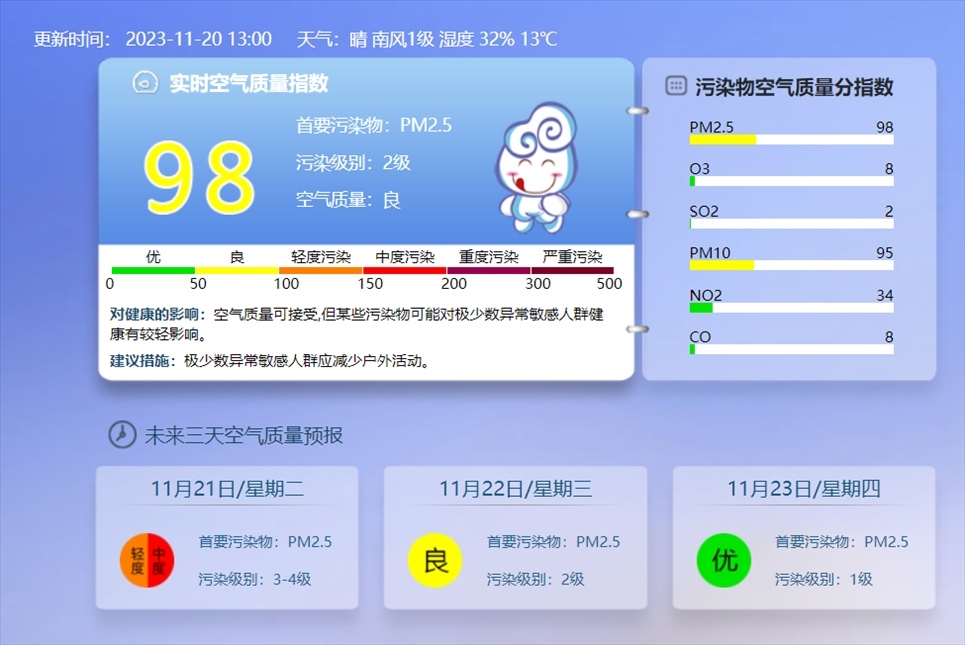 央視網(wǎng)消息:據(jù)@北京環(huán)境監(jiān)測(cè) 消息,11月20日13時(shí)的實(shí)時(shí)空氣質(zhì)量指數(shù),北京目前的污染級(jí)別達(dá)到2級(jí),東城、西城、朝陽、豐臺(tái)、通州、房山、大興等區(qū)已顯示為輕度污染。
