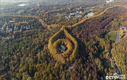 2023年11月19日,南京,初冬時節(jié)的鐘山風景名勝區(qū)層林盡染,色彩斑斕??罩懈╊晃嗤浒鼑拿例g宮,宛如一條“金色項鏈”,美不勝收。