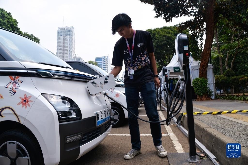 9月29日,在印度尼西亞雅加達(dá)一家商場(chǎng)的地下停車場(chǎng),工作人員為一位五菱新能源車Air ev車主結(jié)束充電。新華社記者 徐欽 攝