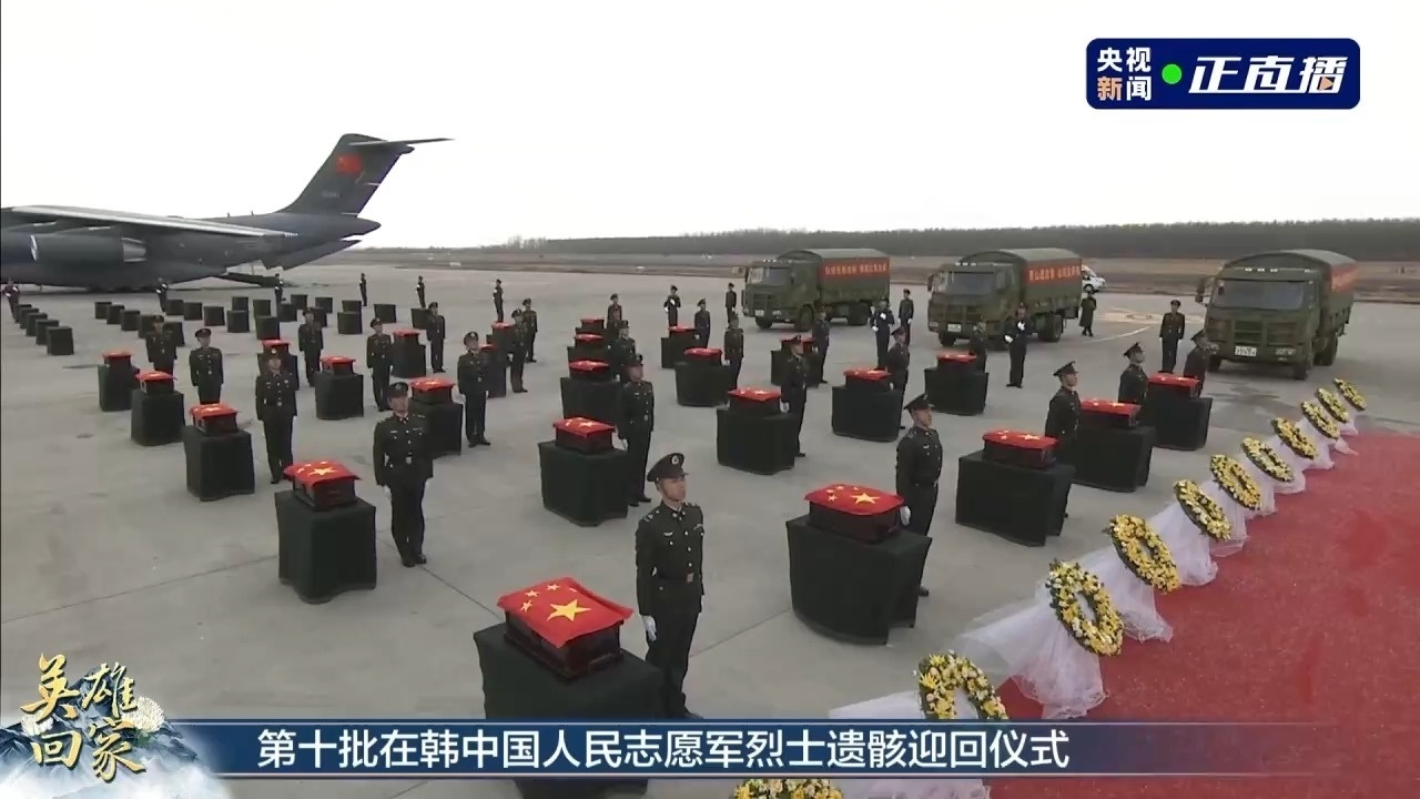 12時(shí)18分,由退役軍人事務(wù)部牽頭組織的志愿軍烈士遺骸迎回儀式在沈陽桃仙國際機(jī)場舉行。來自志愿軍烈士親屬、相關(guān)部門、部隊(duì)官兵等各界代表約1000人參加。儀式結(jié)束后,志愿軍烈士遺骸棺槨被由45輛警用摩托組成的騎警車隊(duì)護(hù)送前往沈陽抗美援朝烈士陵園。24日10時(shí),第十批在韓中國人民志愿軍烈士遺骸安葬儀式將在該陵園志愿軍烈士紀(jì)念廣場舉行。2014年至2022年,已先后有913位從韓國迎接回來的志愿軍烈士在此安息。