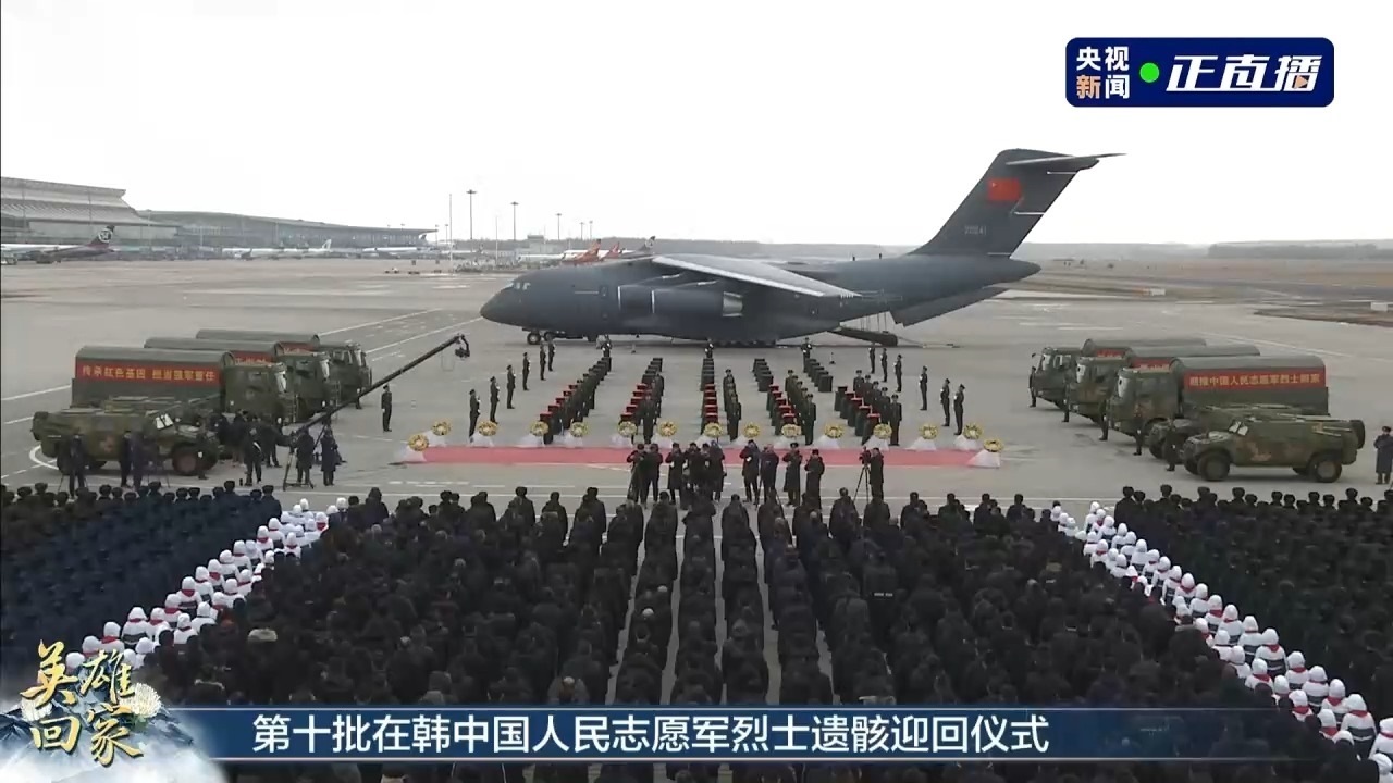 北京時(shí)間上午9時(shí),中韓雙方在韓國仁川國際機(jī)場舉行志愿軍烈士遺骸交接儀式。上午11時(shí)32分,空軍專機(jī)運(yùn)-20緩緩降落在遼寧沈陽桃仙國際機(jī)場。專機(jī)進(jìn)入中國領(lǐng)空后,空軍兩架殲-20戰(zhàn)斗機(jī)護(hù)航,并在沈陽機(jī)場上空拉煙通場,“雙20同框”向志愿軍烈士致以崇高敬意,沈陽桃仙機(jī)場以“過水門”航空最高禮儀迎接志愿軍烈士回家。