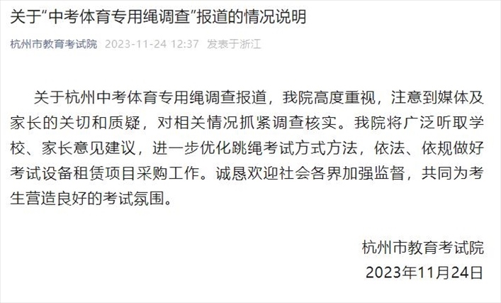 ·中考體育專用跳繩一根賣78元?杭州市教育考試院回應:抓緊調查核實。